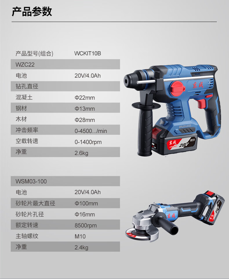 (特)东成20V工业级无刷充电电锤WCKIT10B冲击钻电镐电钻锂电角磨机工具
