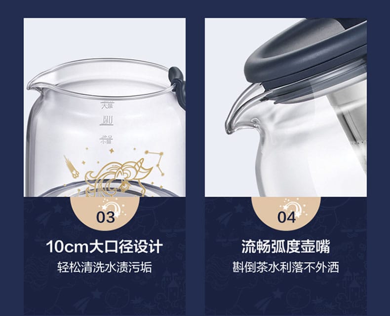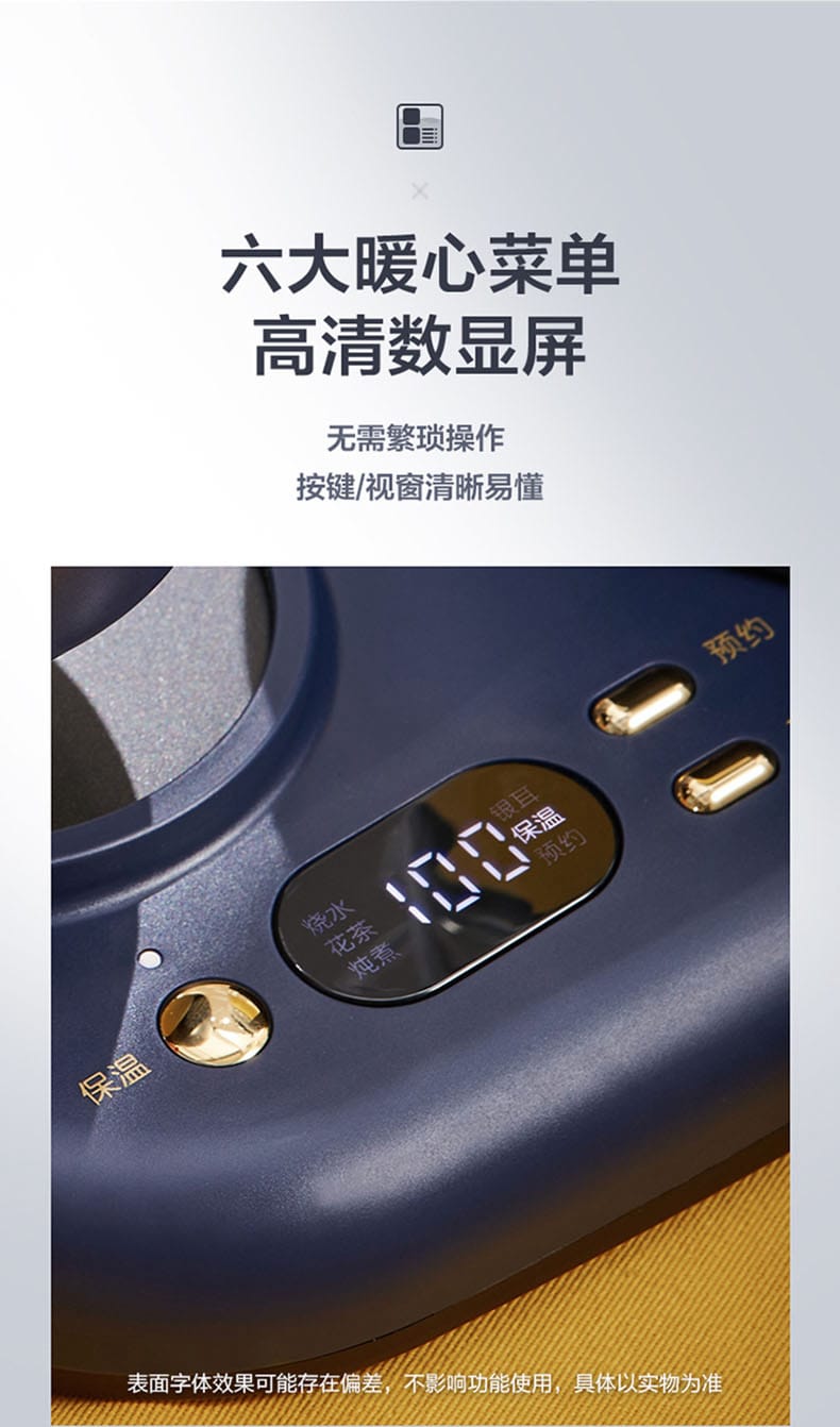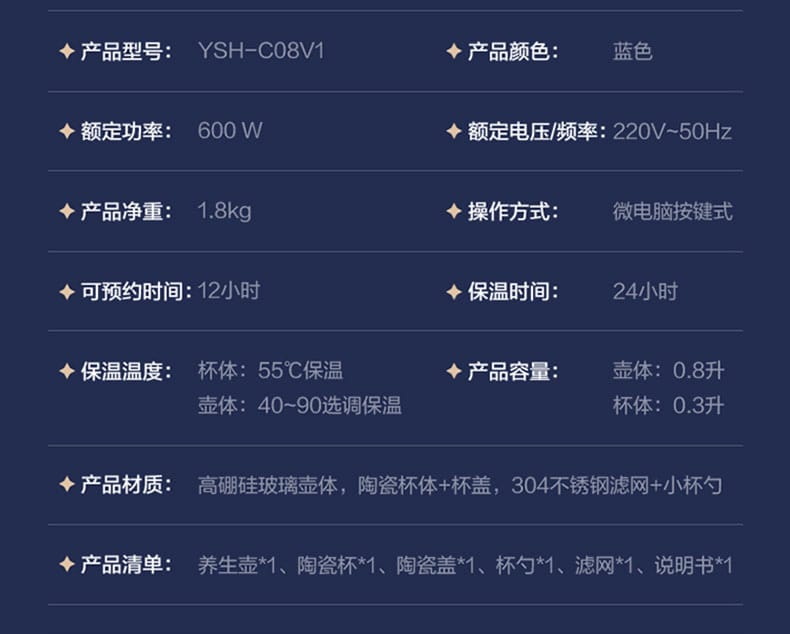 套装搭配形式,养生更专业 6大功能菜单,满足多种养生需求 高硼硅玻璃、304不锈钢发热盘 一键55℃保温