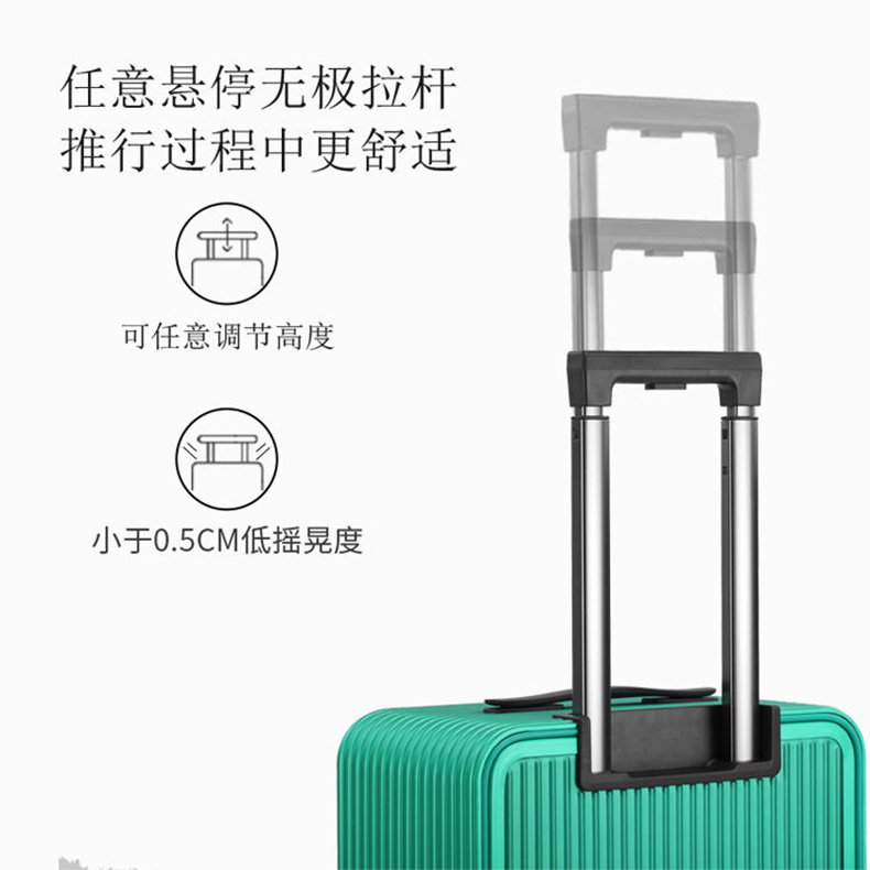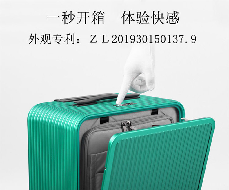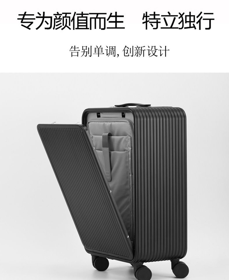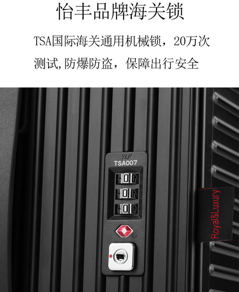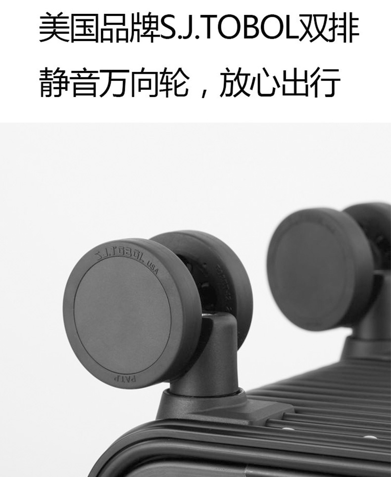 - 材质:ABS壳/尼龙里布/全铝拉杆/双排万向轮/密码锁锁/前置牛津布口袋取物方便