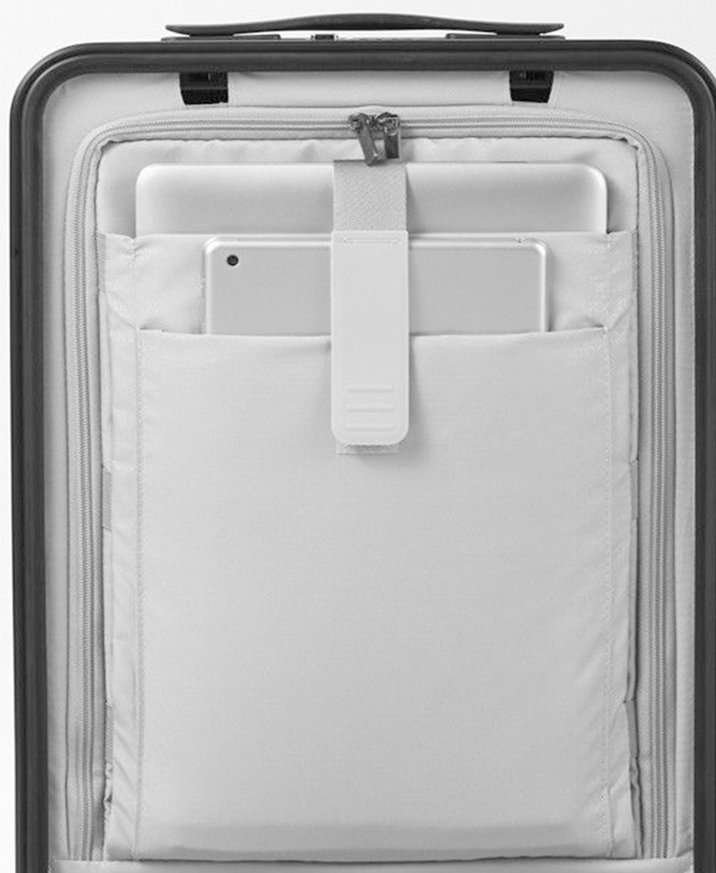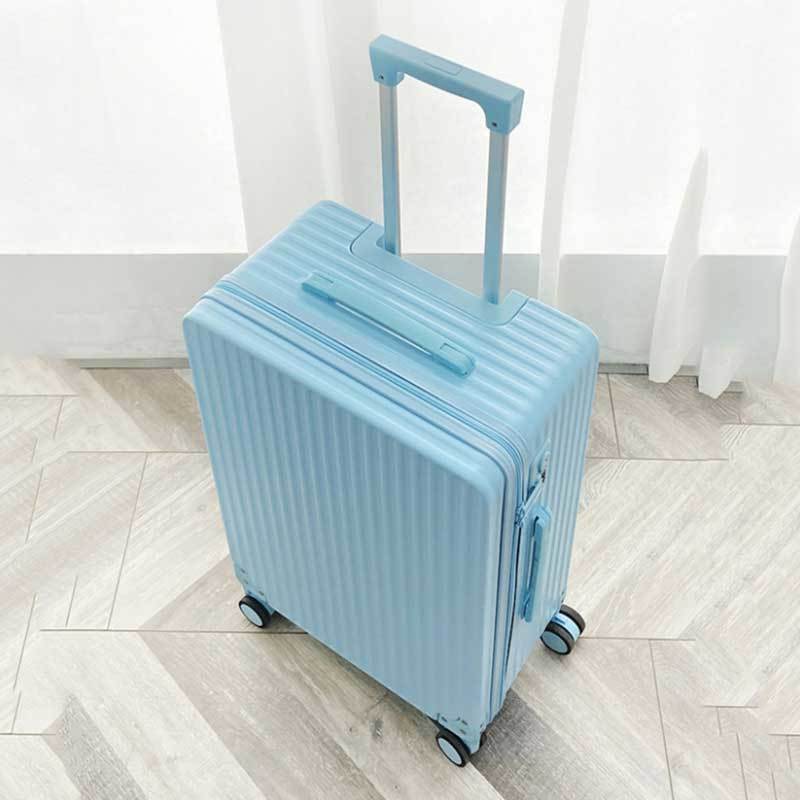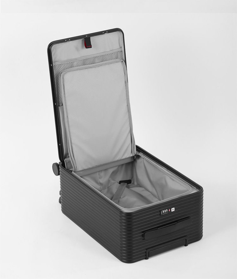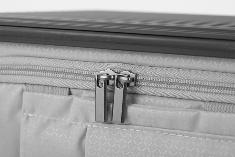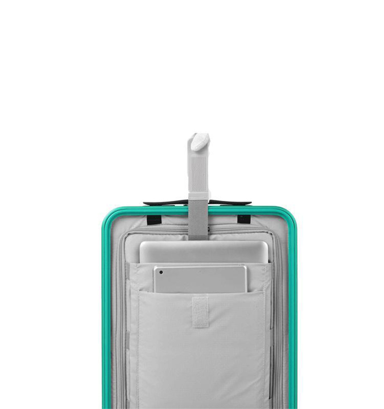- 材质:ABS壳/尼龙里布/全铝拉杆/双排万向轮/密码锁锁/前置牛津布口袋取物方便
