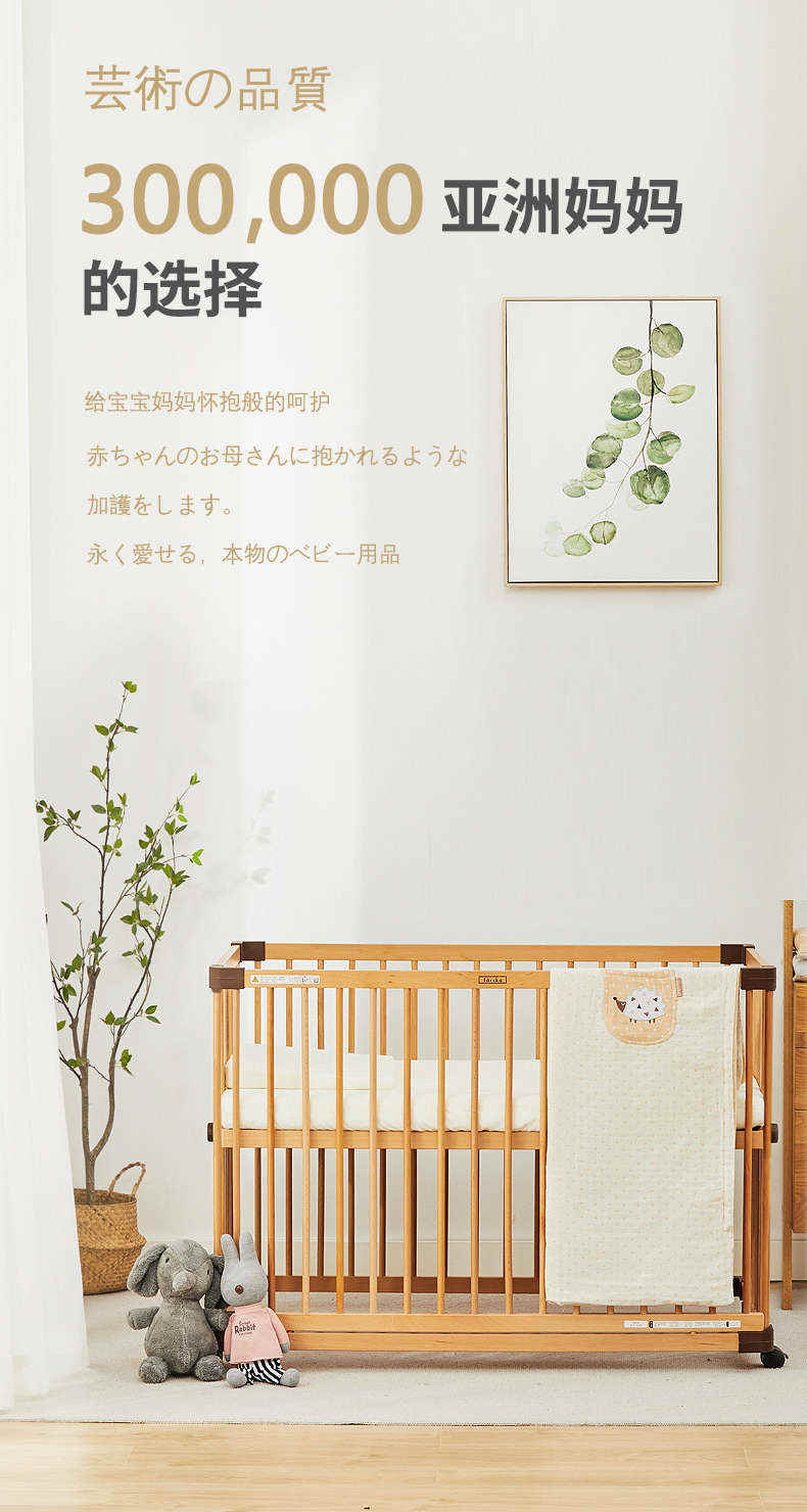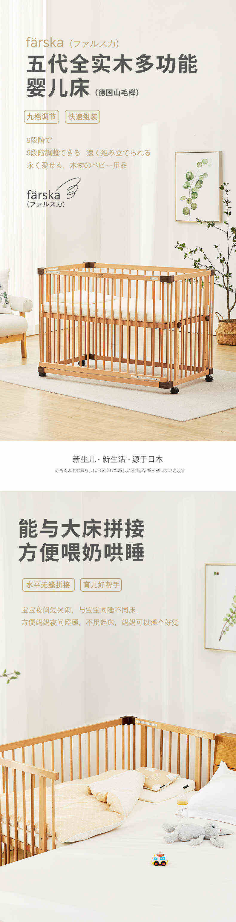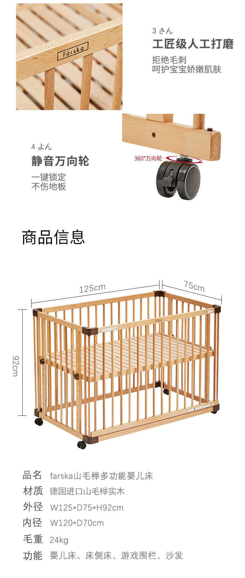 (特)farska实木婴儿床拼接大床 欧洲进口山毛榉多功能游戏床带滚轮 新生儿宝宝环保儿童床 豪华款婴儿床