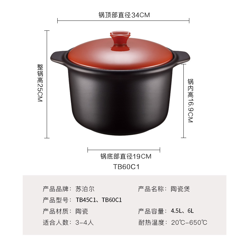 (特)苏泊尔(SUPOR)新陶养生煲怡悦深汤陶瓷煲6.0L砂锅TB60C1