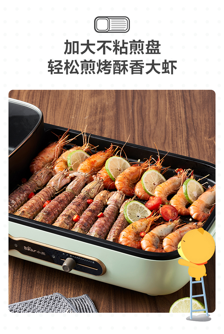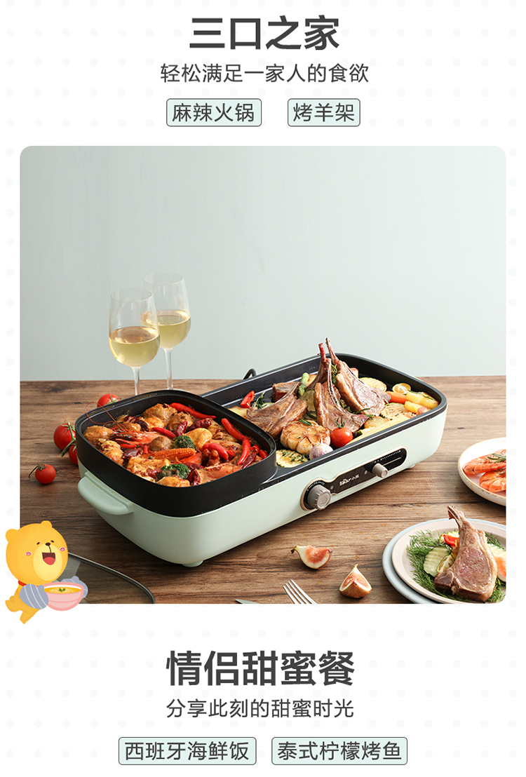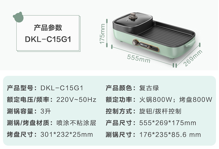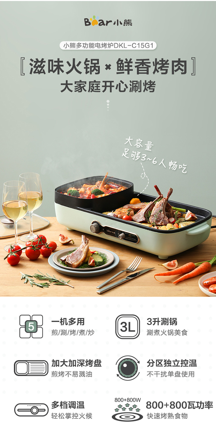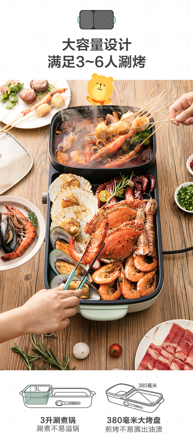 (特)小熊(Bear)烤肉锅 烧烤炉 烤涮一体两用锅电烤盘烤肉机家用烤肉盘多功能电火锅电烤炉DKL-C15G1