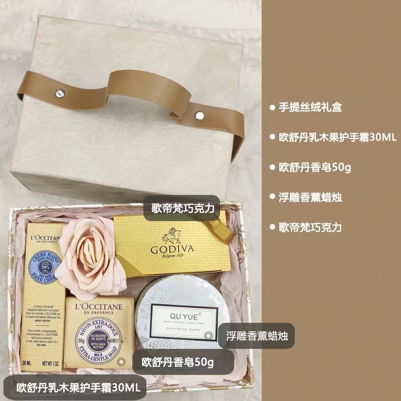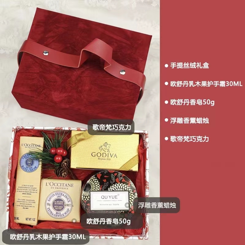 - G款酒红色:歌帝梵巧克力x1 浮雕香薰蜡烛120G 欧舒丹护手霜30ml 欧舒丹香皂50g