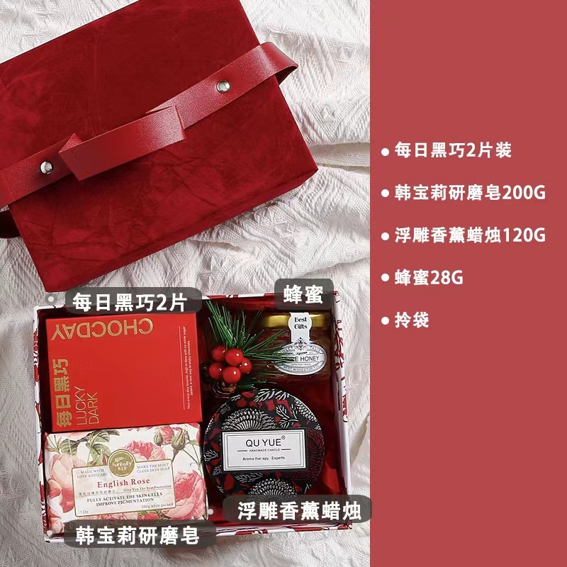 - K款酒红色:每日黑巧2片装 韩宝莉研磨皂200G 浮雕香薰蜡烛120G 蜂蜜28G