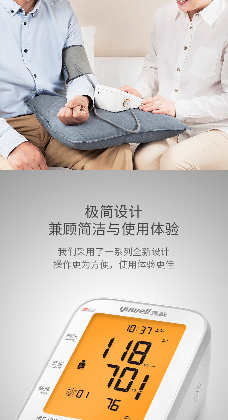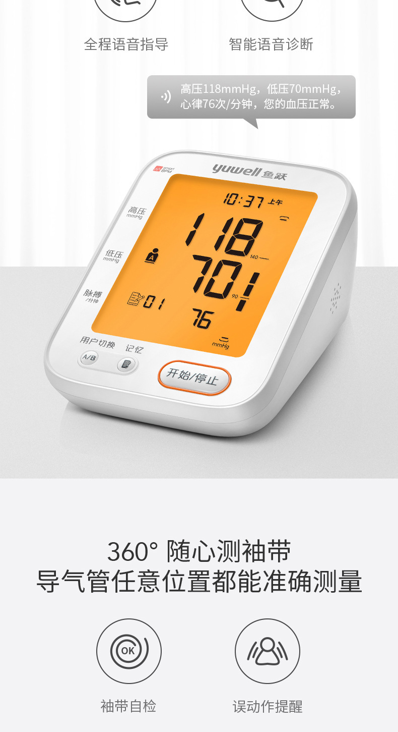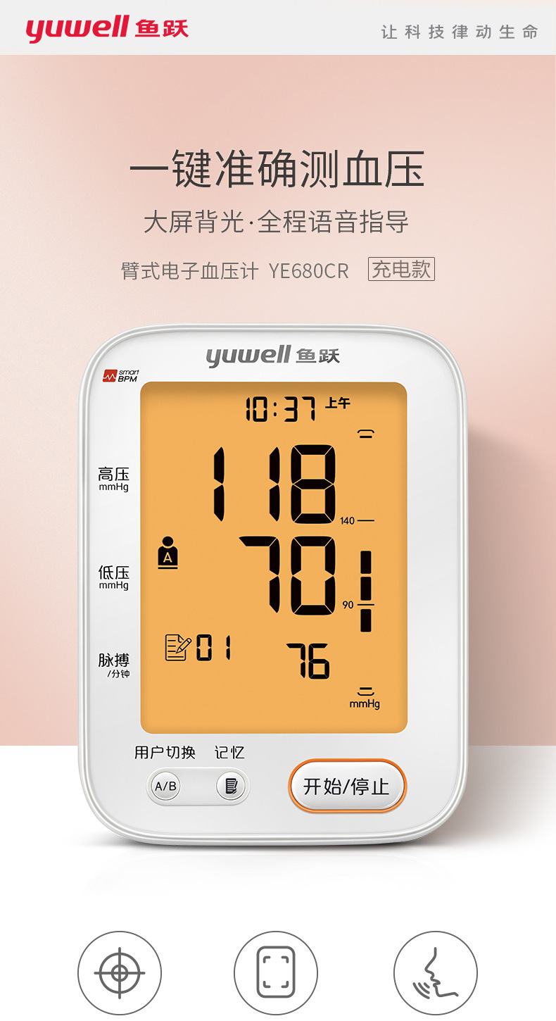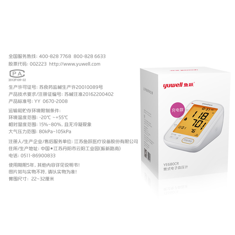 鱼跃电子血压计YE680CR充电语音上臂式全自动精准血压测量仪家用