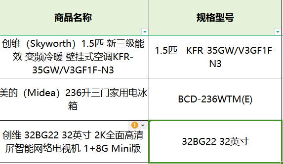 创维(Skyworth)1.5匹 新三级能效 变频冷暖 壁挂式空调KFR-35GW/V3GF1F-N3 美的(Midea)236升三门家用电冰箱BCD-236WTM(E) 创维 32BG22 32英寸 2K全面高清屏智能网络电视机 1+8G Mini版32BG22 32英寸