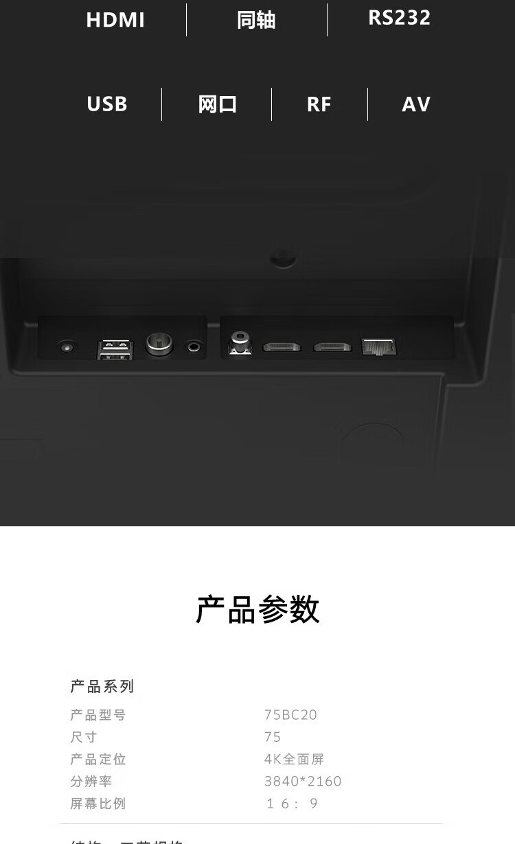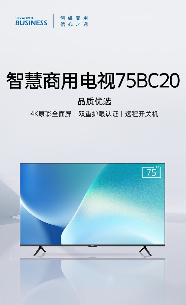 创维(Skyworth)75BC20 75英寸4K超高清 全面屏酒店功能 人工智能家用商用电视75BC20