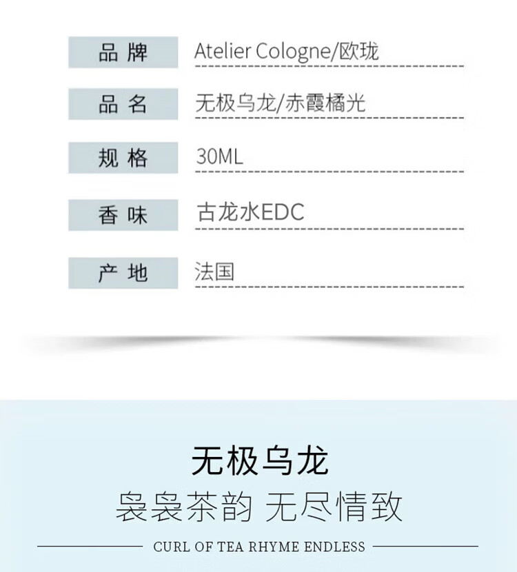 (特)欧珑(Atelier Cologne)无极乌龙香水 30ml 柑橘木质调留香香氛